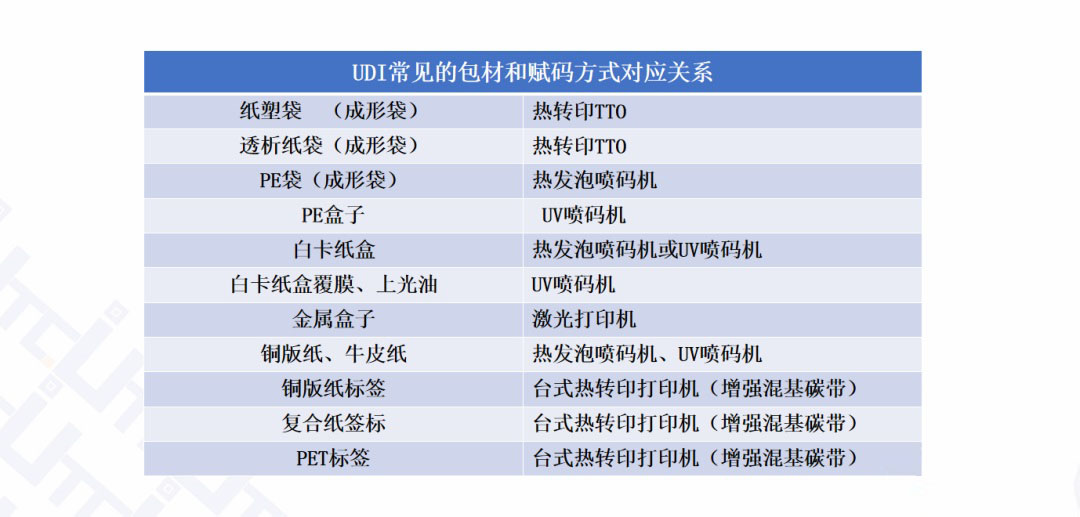標(biāo)簽作為UDI賦碼的載體需要附著在產(chǎn)品包裝上,因而包裝的材質(zhì)和賦碼打印方式之間也是有著對(duì)應(yīng)關(guān)系的。比如,金屬類的材質(zhì)表面就更適合應(yīng)用激光打碼。
