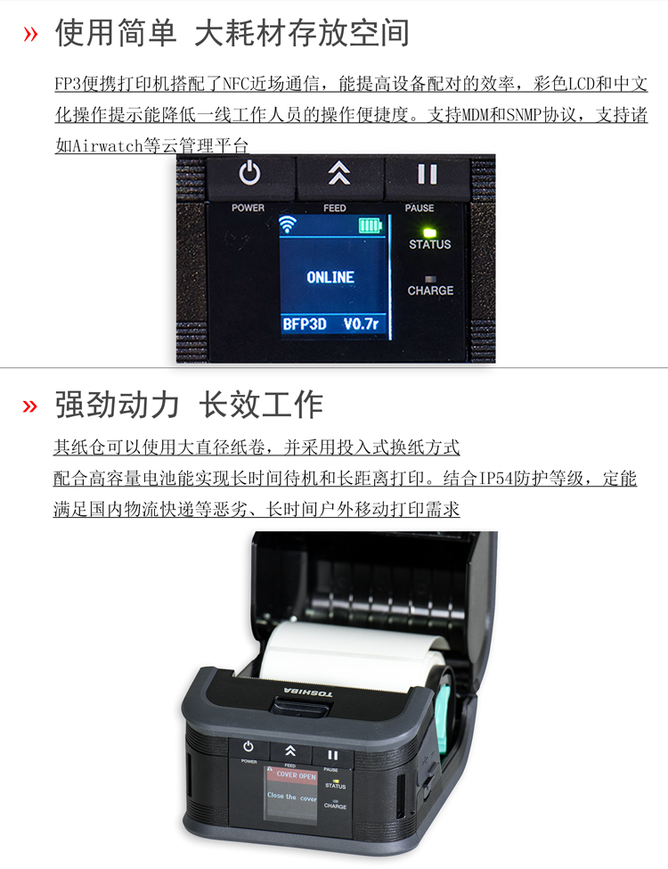 東芝將創(chuàng)新移動(dòng)打印技術(shù)帶到你的手中,F(xiàn)P3D加強(qiáng)版3寸便攜式熱敏打印機(jī),擁有6IPS(152mm/s)高速打印、彩色中文液晶屏、自動(dòng)剝離等技術(shù),蘊(yùn)含著東芝對(duì)于便攜性、可靠性、高性能和創(chuàng)新性的承諾,滿足各類便攜打印的應(yīng)用需求。廣泛的應(yīng)用領(lǐng)域:電子商務(wù)/物流/快遞行業(yè)/零售業(yè)/政府/公共事業(yè)/醫(yī)療 聯(lián)系人:李先生 手機(jī):18929304946 陳小姐(業(yè)務(wù)):18929304947