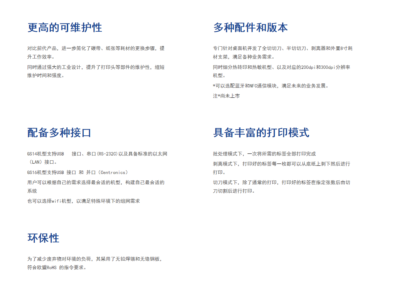標(biāo)準(zhǔn)接口GS14及TS14機(jī)型(串口(RS-232C), LAN10/100 Base, USB2.0, USB Host) GS16及TS16機(jī)型(并口(Centronics), USB2.0, USB Host)